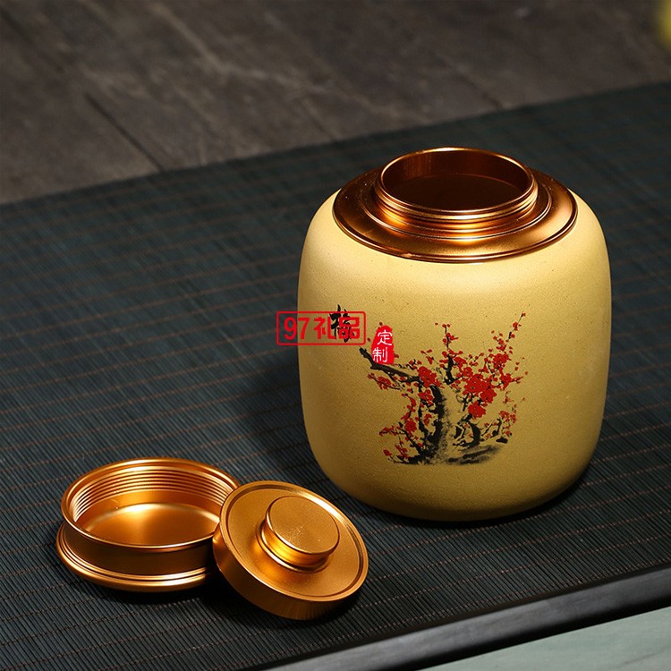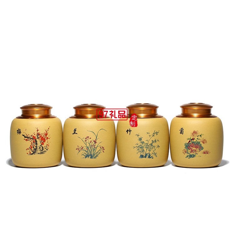 紫砂彩繪梅蘭竹菊茶葉罐原礦段泥陶罐茶葉缸定制公司廣告禮品