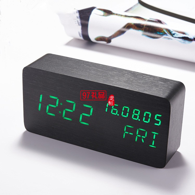 長方形萬年歷木鐘桌面 led電子聲控木頭鐘學(xué)生喚醒鬧鐘