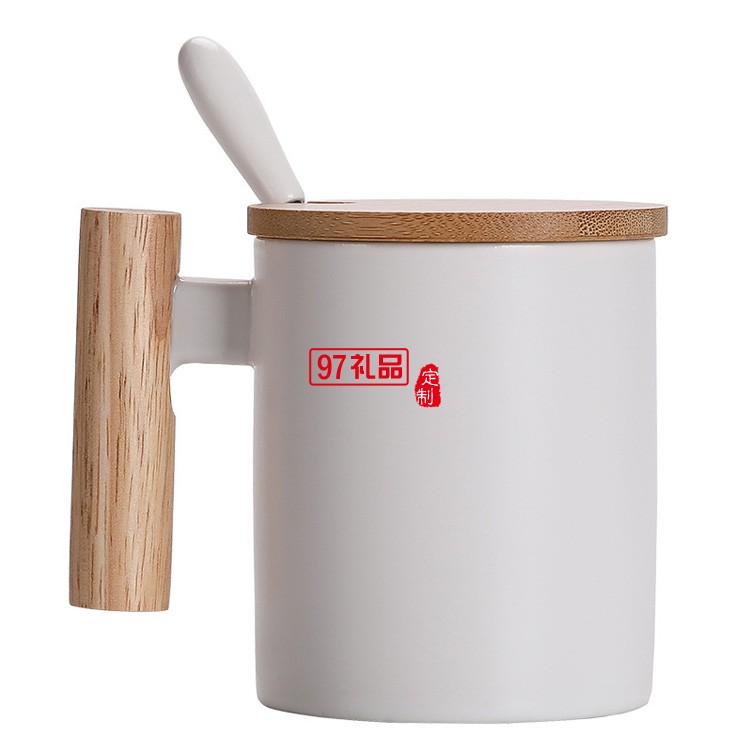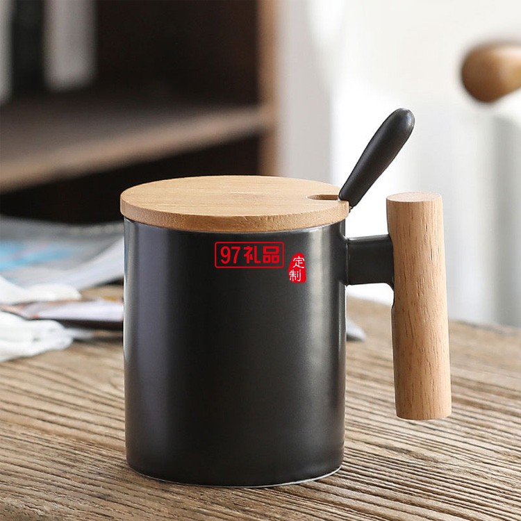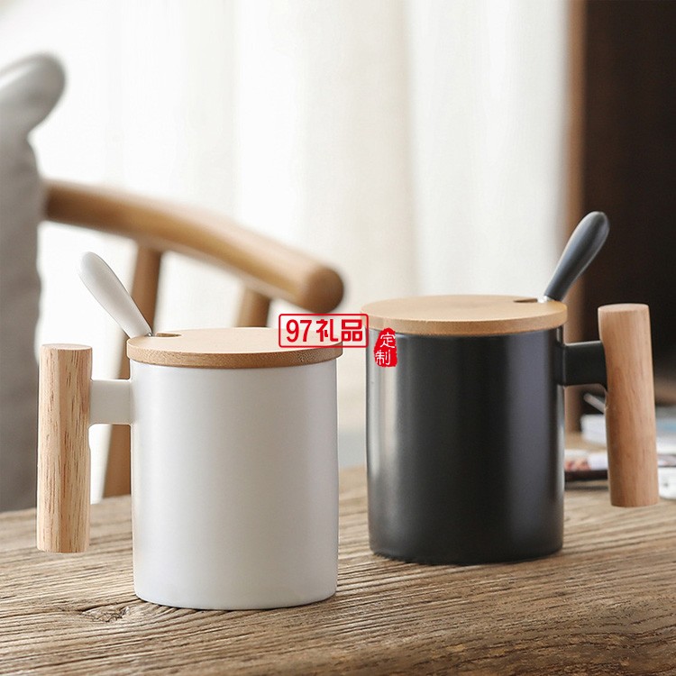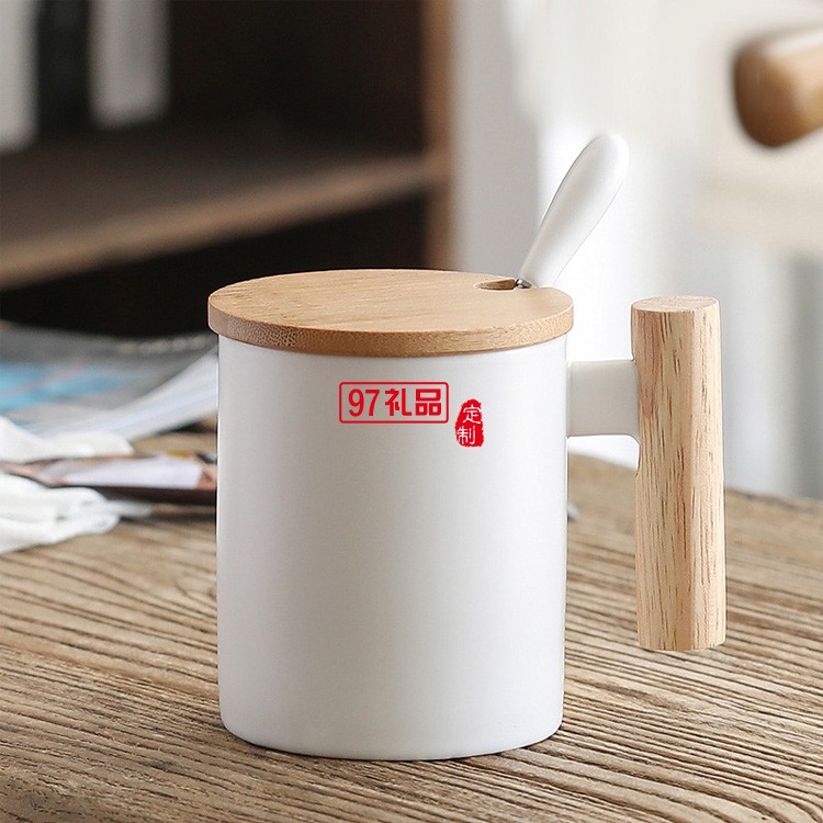簡約馬克杯 創(chuàng)意文藝水杯咖啡杯木手柄陶瓷杯帶蓋勺