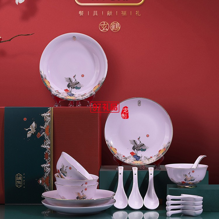 描金影青麒麟玄鶴款餐具新款祥瑞玉瓷碗盤