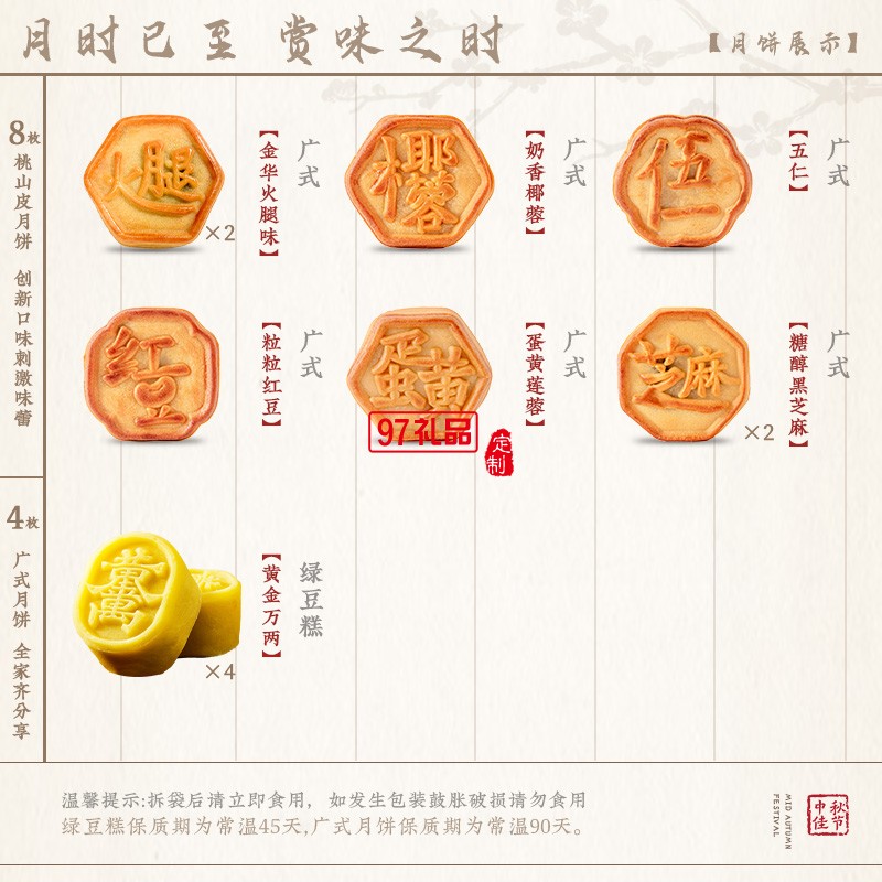 內(nèi)容物:廣式金華火腿60g*2 廣式黑芝麻60g*2 廣式五仁60g