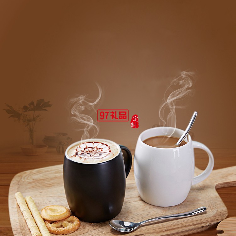 陶瓷水杯 450ml帶蓋帶勺馬克杯 亞光酒桶咖啡杯禮品杯子定制