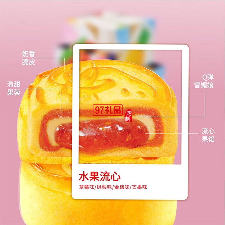 產(chǎn)品描述: Q彈有嚼勁的雪媚娘包裹果香四溢水果流心餡,四層餡