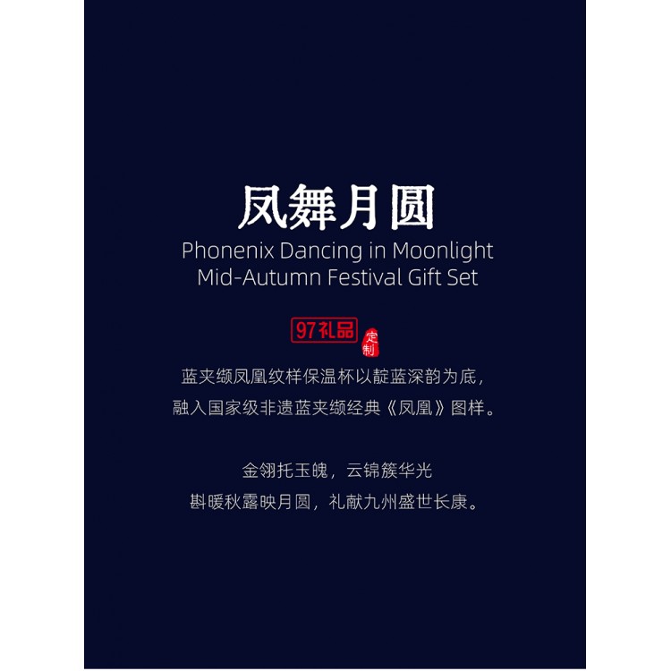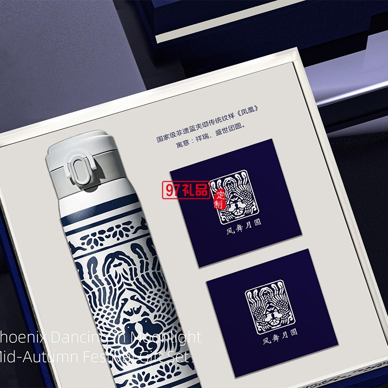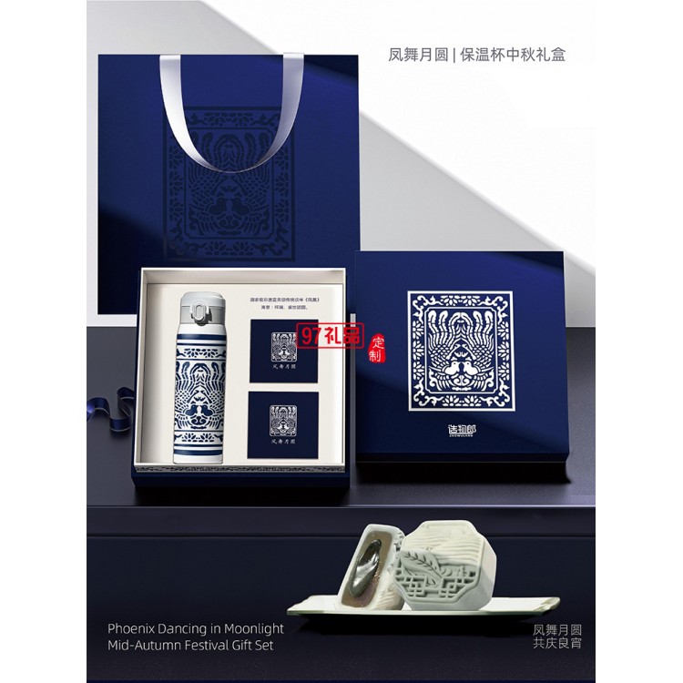 鳳舞月圓青花瓷圖案保溫杯月餅中秋禮盒